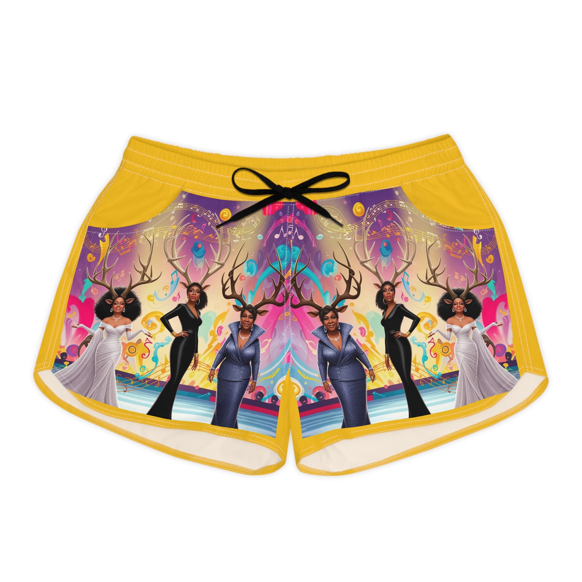 Bright, lightweight shorts designed for movement and self-expression. The vibrant all-over print blends bold colors and whimsical motifs — from elegant figures to surreal, nature-inspired elements — creating a playful, gallery-ready look. Cut for a regular fit with an elastic drawstring waistband and side pockets, these shorts feel breezy and sit comfortably for days at the beach, dance rehearsals, or casual strolls. The ultra-light 100% polyester fabric dries quickly and keeps its shape, while clean white seam stitching and a sewn-in care label add practical finishing touches. These shorts bring color and confidence to active, creative wardrobes.