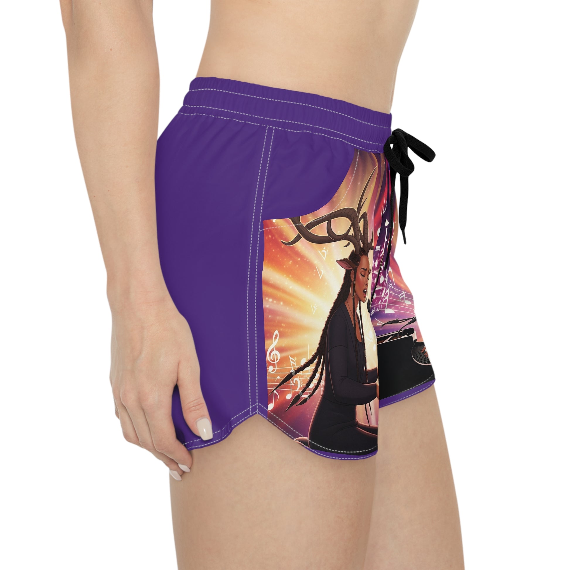 These lightweight shorts bring a burst of music and magic to warm days and cozy rehearsals. Soft, quick-drying polyester keeps you cool while the adjustable drawstring and elastic waistband let you dial in a comfortable fit. Bold artwork wraps the front: a mirrored scene of a singer-pianist crowned with elegant antlers, bathed in sunset hues and floating musical notes. Two side pockets hold small essentials between sets or on the street. Wear them to late-summer festivals, morning practice sessions, or lazy afternoons when you want color, comfort, and a little theatrical flair.
